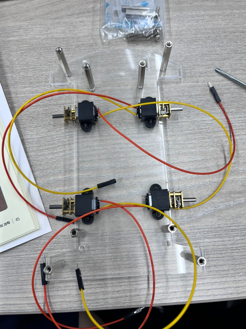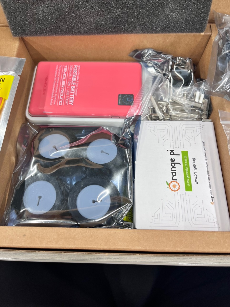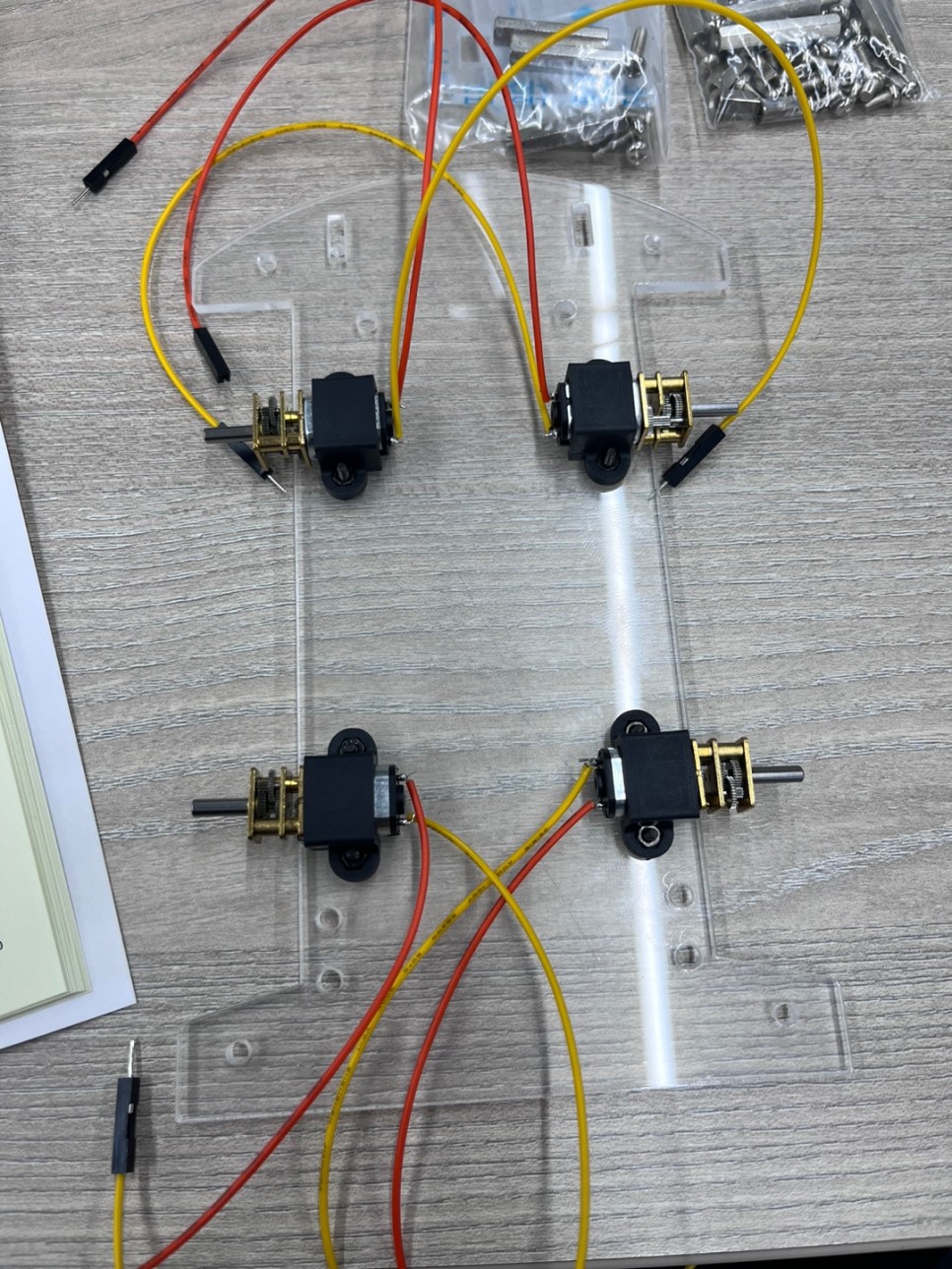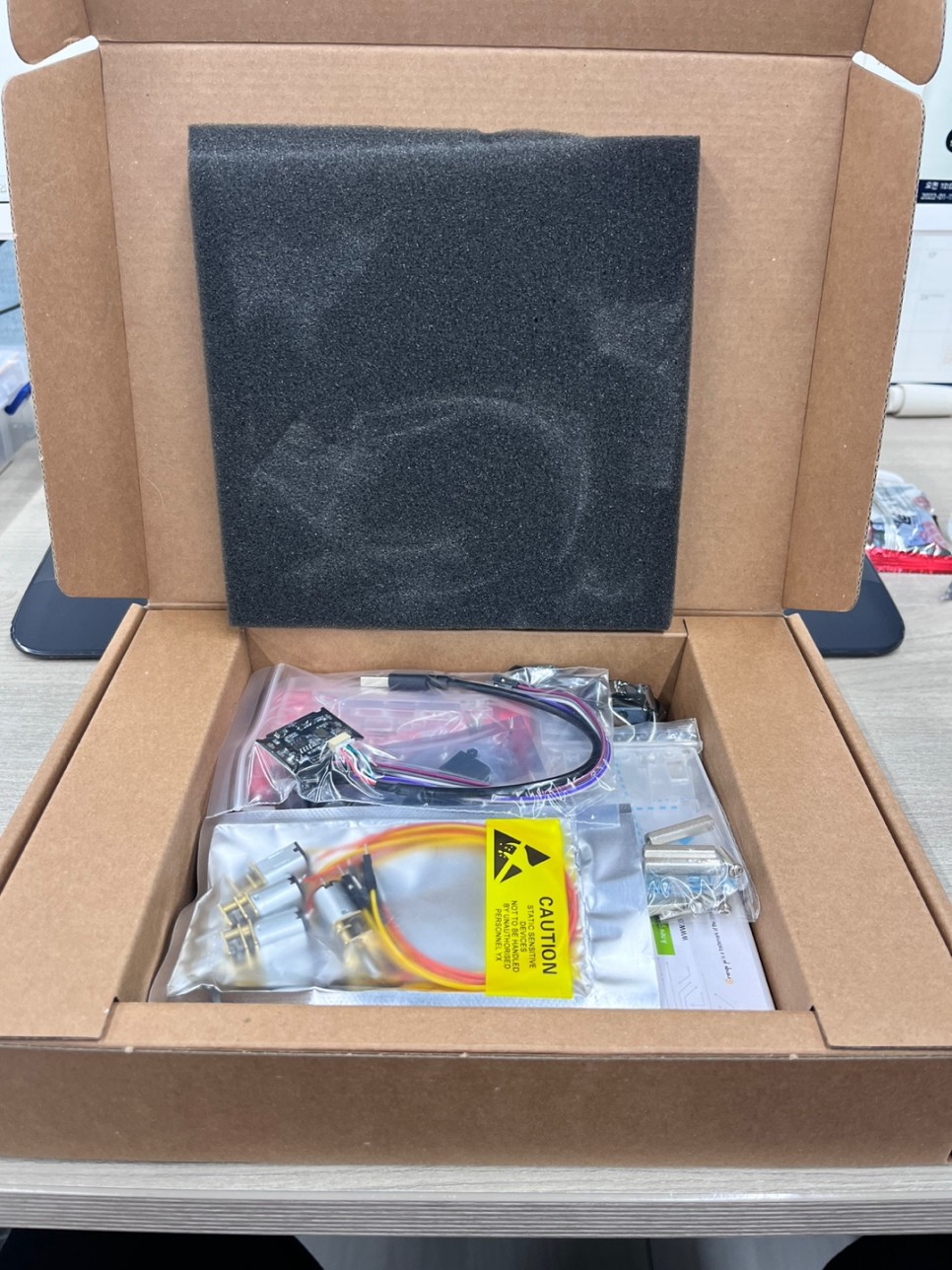 모터, 카메라, 바퀴, 선, sd카드, sd 판독기, 심지어는 모바일 배터리까지 활동에 필요한 부품이 모두 들어 있습니다.(활동에 초음파 센서를 조립하는 활동이 있지만 초음파 센서는 들어있지 않습니다.) 하지만 초음파 센서가 없다고 해서 활동하는 데 제한이 없습니다.)