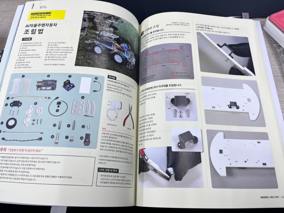 설명서는 매거진 형식으로 되어있습니다.자율주행차에 대한 설명과 관련 이슈, 조립법과 회로도가 상세하게 적혀있어 한번도 조립해 보지 않은 사람도 쉽게 만들 수 있어요!
