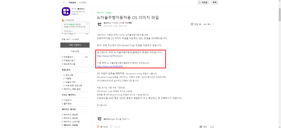 혹시 문제가 생기거나 모르는 것이 있으면 아래 사이트를 참고해주세요.https://cafe.naver.com/makersmagazine/316 업그레이드 버전의 AI 자율주행 자동차를 사용하셨을 때 문제가 생겼나요? 대부분은 사용자의 사소한 실수가 원인인 경우가 많습니다. 실망하지 마세요. 숙련된 사람도 가끔은 엉뚱한 실수… cafe.naver.com