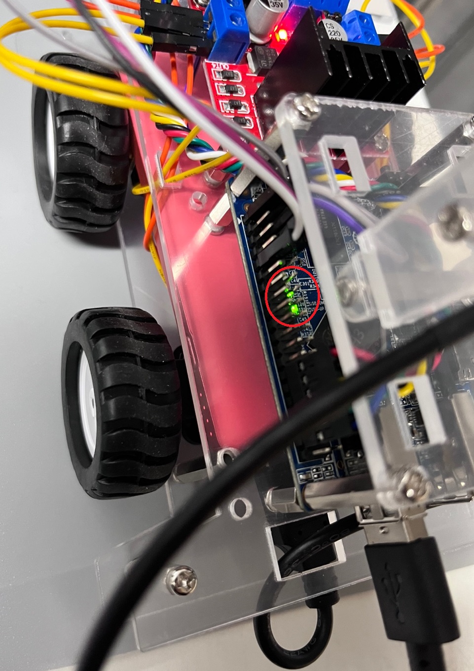 sd카드를 RC카에 ‘찰칵’ 소리가 날 때까지 넣으면 RC카의 기동이 시작됩니다.기동이 잘 된 RC카는 녹색 신호가 켜집니다.