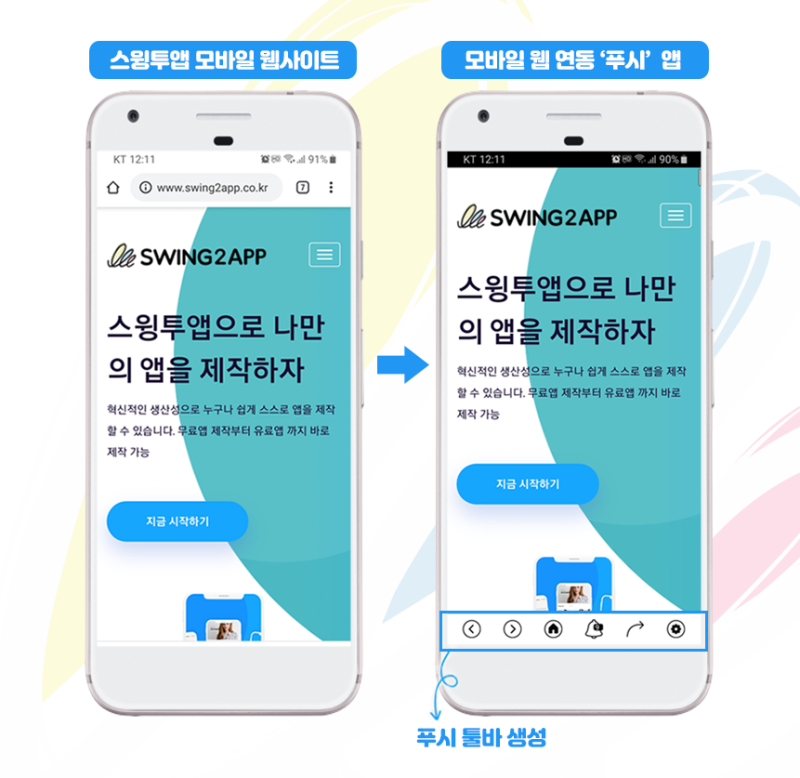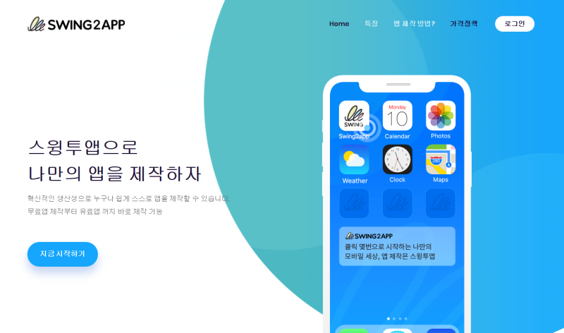 스윙투앱 홈페이지 대문입니다. 나만의 앱을 제작하자가 메인 문구입니다.