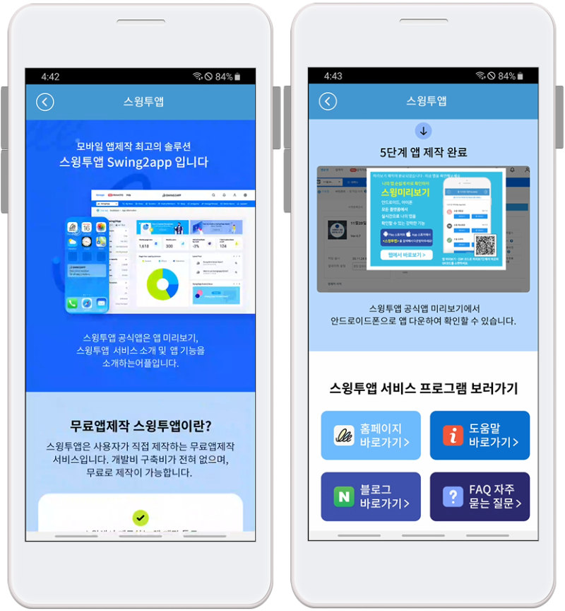 오늘 보내드릴 정보는 무료 앱(애플리케이션) 제작 프로그램 스윙 투 앱입니다. 요즘 정말 좋은 프로그램들이 많이 나와서