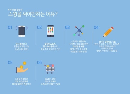 이미 만들어진 템플릿에 글자만 추가해서 만들 수 있는 홈페이지 프로그램인 WIX까지 나왔지만 이제는 30분 만에 스마트폰 애플리케이션을 쉽게 만들 수 있는 스윙 투 앱이라는 프로그램까지 나왔습니다.