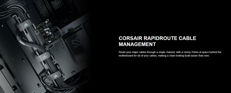CORSAIR Rapid Route 케이블 관리 시스템을 사용하면 모든 케이블을 위한 메인보드 뒤로 25mm의 넓은 공간을 제공하여 단일 채널을 통해 주요 케이블을 쉽고 빠르게 라우팅할 수 있습니다.