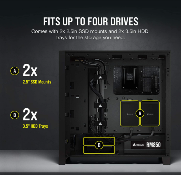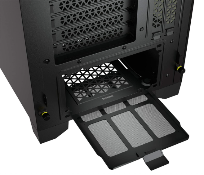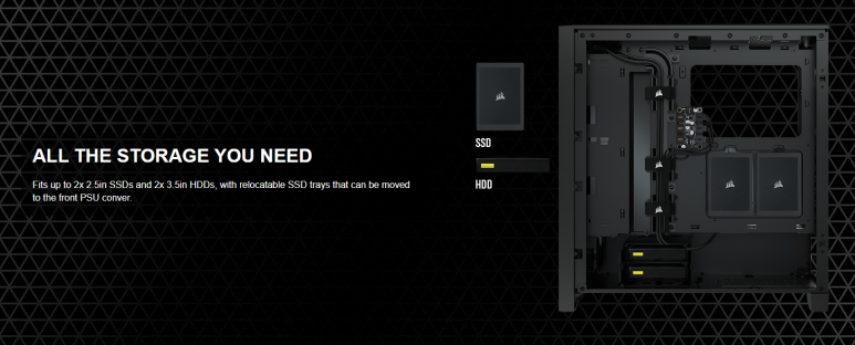 필요한 모든 스토리지, 최대 2개의 2.5인치 SSD 및 2개의 3.5인치 HDD에 적합하며 전면 PSU 컨버로 이동할 수 있는 재배치 가능한 SSD 트레이가 있습니다.