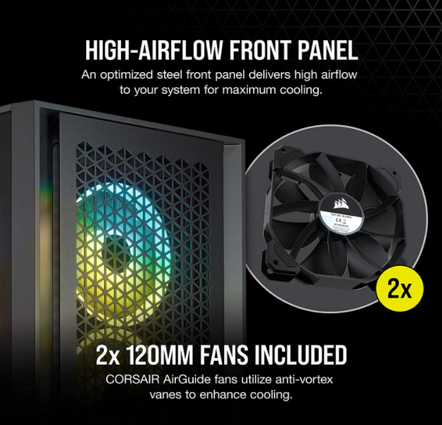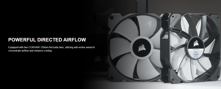 2개의 CORSAIR 120mm Air Guide 팬이 함유되어 소용돌이 방지 베인을 사용하여 공기의 흐름을 집중시키고 냉각을 향상시킵니다.