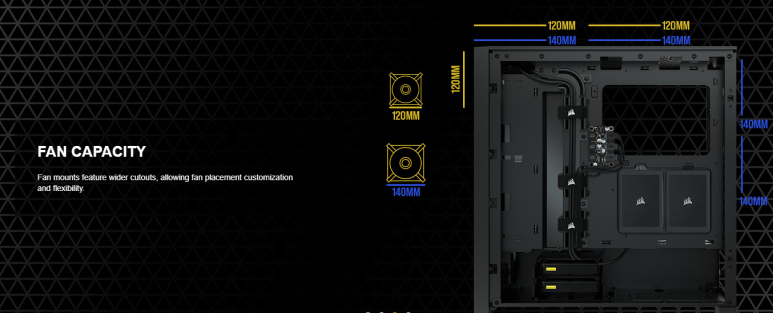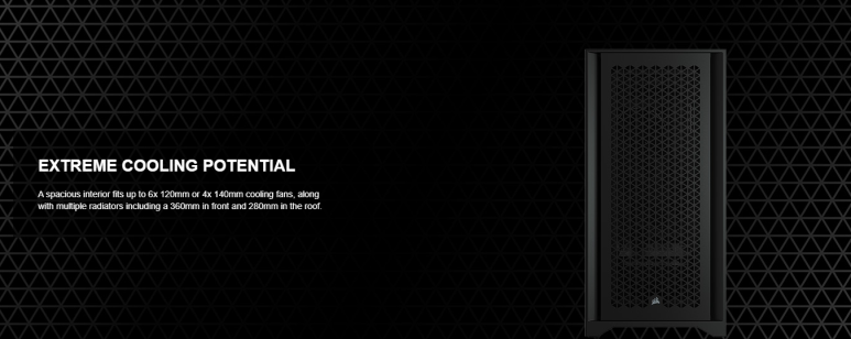 넓은 내부는 최대 6 x 120mm 또는 4 x 140mm 냉각팬과 함께 전면 360mm, 지붕 280mm(RAM 높이에 따라 다름)를 포함한 여러 라디에이터에 적합합니다.