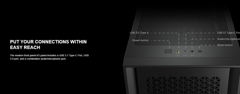 쉽게 도달할 수 있는 연결 최신 전면 패널 I/O 패널에는 USB 3.1 Type-C 포트, USB 3.0 포트 및 조합 오디오/마이크 잭이 포함됩니다.