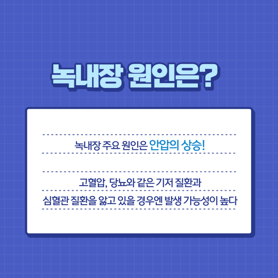 녹내장이 일어나는 주된 원인은 안압의 상승에 의한 시신경의 손상입니다. 안구는 방수라는 물이 생성되어 일정한 안압을 유지하는데 방수가 과도하게 생성되거나 배출이 적어지는 순환 장애로 인해 안압이 상승, 시신경이 손상될 수 있습니다. 고혈압, 당뇨, 심혈관 질환 등을 앓고 있으면 발병할 가능성이 높아집니다.