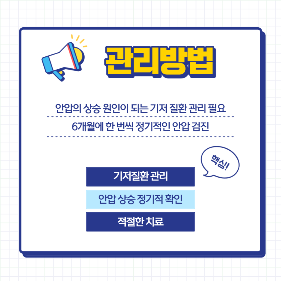 따라서 평소 고혈압, 당뇨, 심혈관질환 등의 문제가 있는 경우에는 지속적인 질환 관리와 함께 안압이 상승하고 있지 않은지 6개월에 한번 정도 지속적으로 검사해야 합니다. 안압 검사는 안과에 와 주시면 간단한 절차를 통해 확인할 수 있습니다.