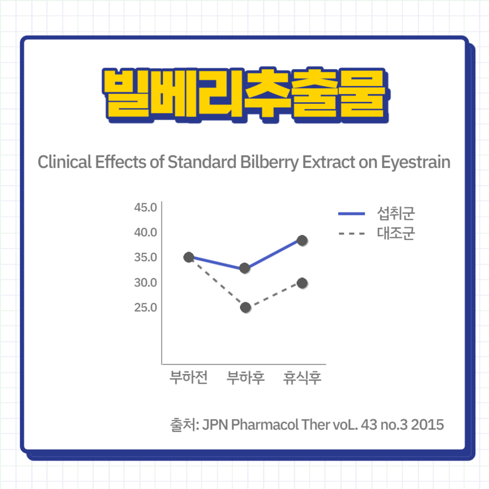 실제로 빌베리 추출물을 섭취군과 대조군으로 나누어 적용한 인체 적용 시험 결과, 4주 동안 빌베리 추출물을 섭취한 실험군 눈의 피로감이 감소했음을 확인할 수 있었습니다. 이는 즉, 빌베리 추출물을 지속적으로 섭취한다는 것은 눈 주변부 근육의 과도한 긴장감 해소와 초점 맞추기에 용이함을 더할 수 있다는 것을 의미합니다.