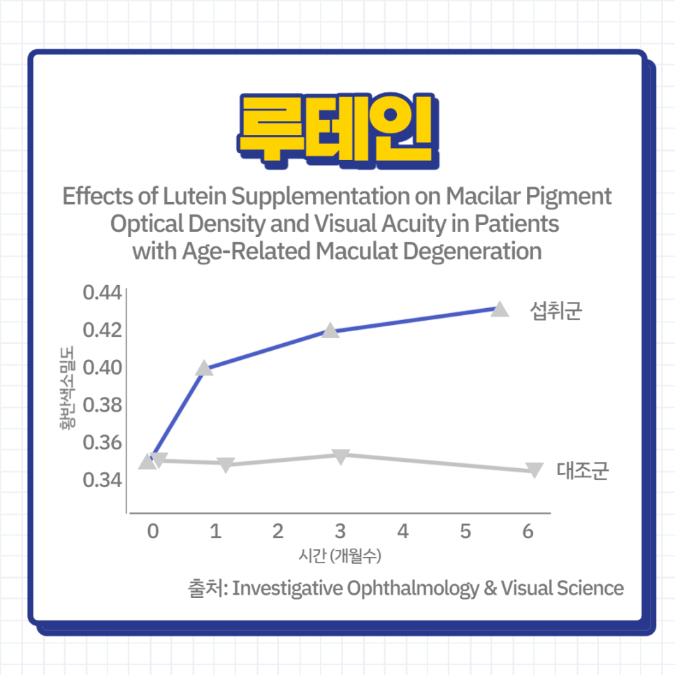 루테인은 망막과 수정체에 축적되는 성분으로 황반의 색소밀도를 유지하여 눈의 노화를 관리하는 중요한 역할을 합니다. 황반은 시세포가 밀집되어 있어 빛을 가장 선명하게 받아들이는 지점으로 색소밀도 유지를 통해 관리해야 합니다. 루테인을 180일간 계속 섭취하게 한 인체 적용 시험에서는 섭취군의 황반 색소 밀도가 유의하게 증가했다는 결과도 있었습니다.