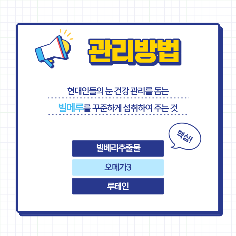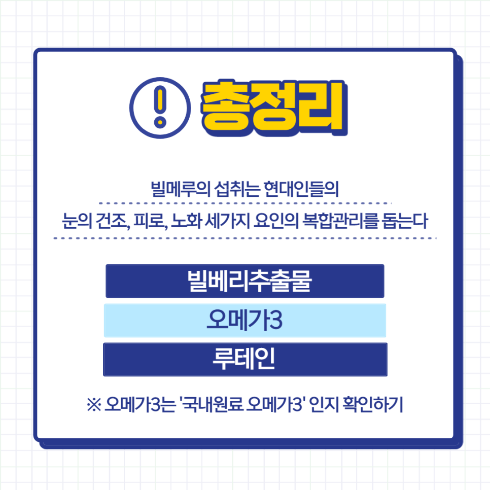 지금까지 녹내장의 원인과 앞으로의 관리를 위한 눈의 건조, 피로, 노화를 일으키는 빌딩 메일에 대해 알아보았습니다. 빌베리추출물, 오메가3, 루테인의 조합은 현대인의 안압상승 그리고 안구노화를 일으키는 요인들을 두루 관리하는 데 도움을 줍니다. 그렇기 때문에 평소에 눈을 관리하는 것이 좋습니다. 이 때 오메가3의 경우 산패의 위험을 고려하여 반드시 국내 원료인 오메가3를 체크하는 것이 중요합니다.