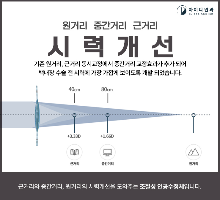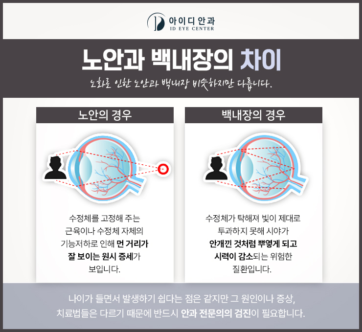 우리 모두는 하루하루 살아가면서 나이가 들면 그에 맞게 몸의 기능이 악화되기 시작합니다. 우리 눈도 마찬가지로 나이를 하나하나 먹으면 망막에 상이 생기도록 초점을 조정하는 역할을 하는 수정체의 기능이 점차 감퇴되기 시작합니다. 그래서 신문을 읽거나 휴대전화를 볼 때 근처에 있는 작은 글씨가 잘 보이지 않는 등의 불편한 증상이 시작되고 있습니다. 노화로 시작되는 아주 자연스런 문제이기 때문에 일상의 불편함을 참고 안경이나 돋보기를 끼고 사는 분들도 계시겠지만, 가까운 거리에서 하는 작업에 어려움이 발생하고 삶의 질도 떨어지므로 전문적인 의료기관을 찾아보시는 것도 도움이 될 것입니다.