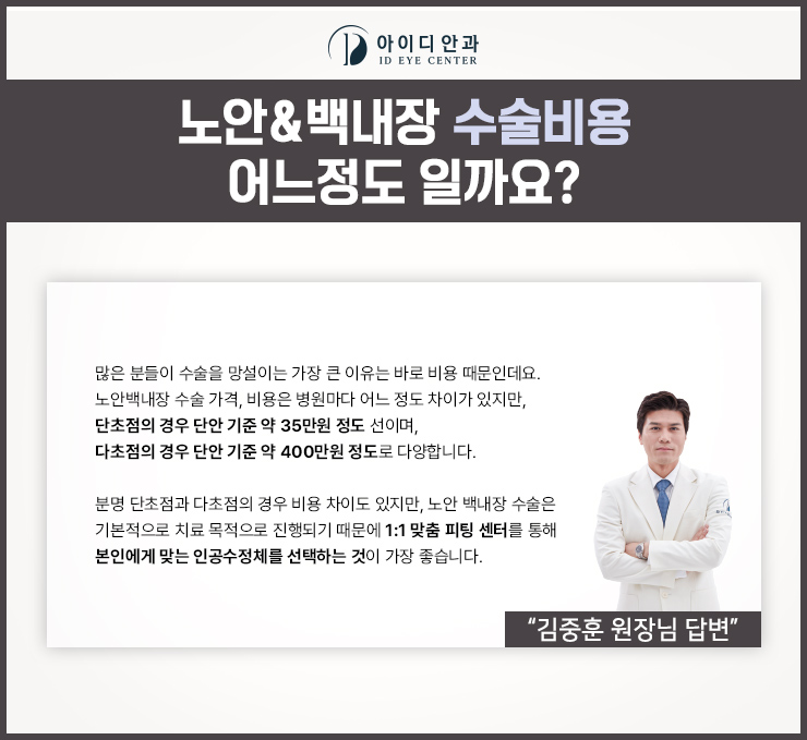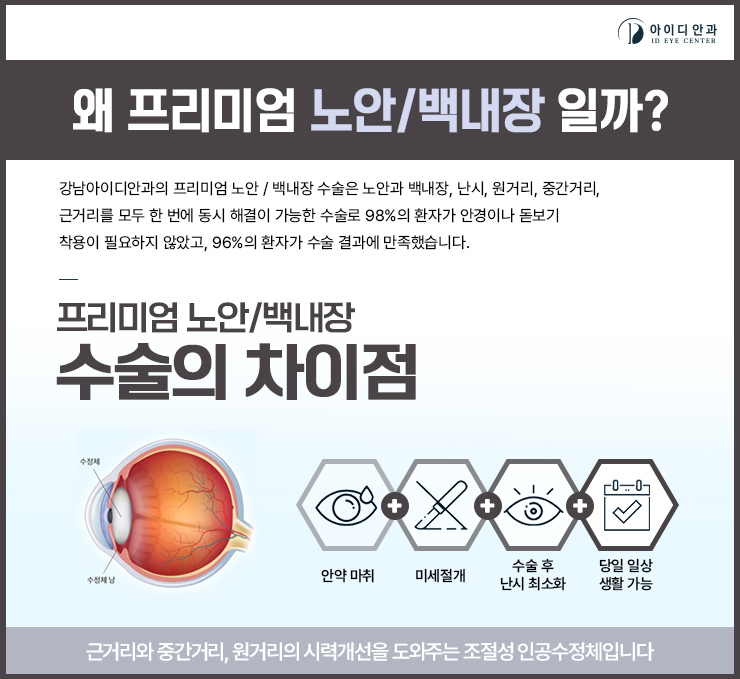 본 병원은 노안백내장 수술 경험이 매우 풍부한 4명의 대표원장 선생님이 61가지 정도의 섬세한 눈 종합검진과 더불어 생활방법을 파악하여 가장 좋은 치료방법을 안내해 드립니다. 환자의 현재 나이와 눈의 상태(안축길이, 앞쪽깊이)등을 고려하여 7가지 다초점 프리미엄 인공수정체를 준비하고 있습니다. 그렇지만, 일반 백내장 수술과 비교하면 비용이 비싼 편이라는 특징이 있습니다. 하지만 저비용의 경우는 주사로 마취를 하거나 절개하는 범위가 크고, 회복하는 데 필요한 시간이 길다는 특징이 있어요. 뿐만 아니라 수술이 끝난 후에도 난시가 일어날 수 있기 때문에 안경 또는 돋보기를 쓸 수도 있었죠. 이곳에서는 안약점안을 통해 마취를 하고 절개범위가 작기 때문에 회복까지의 시간이 짧다는 특징이 있습니다. 그 외 백내장 수술에 비해 노안 및 백내장 증상을 한꺼번에 교정할 수 있으므로 수술이 끝난 후 불편함이 적고 난시 후유증도 줄일 수 있습니다.