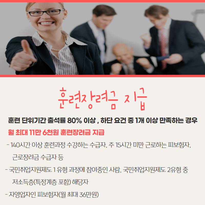 - 이 중 하나만 해당되며, 집체교육 80% 이상 출석했을 경우, 월 최대 ᅳ일을 추가로 받을 수 있습니다.자영업자의 경우 월 최대 ᅡᅵ까지 지원 가능하오니 참고하시기 바랍니다.