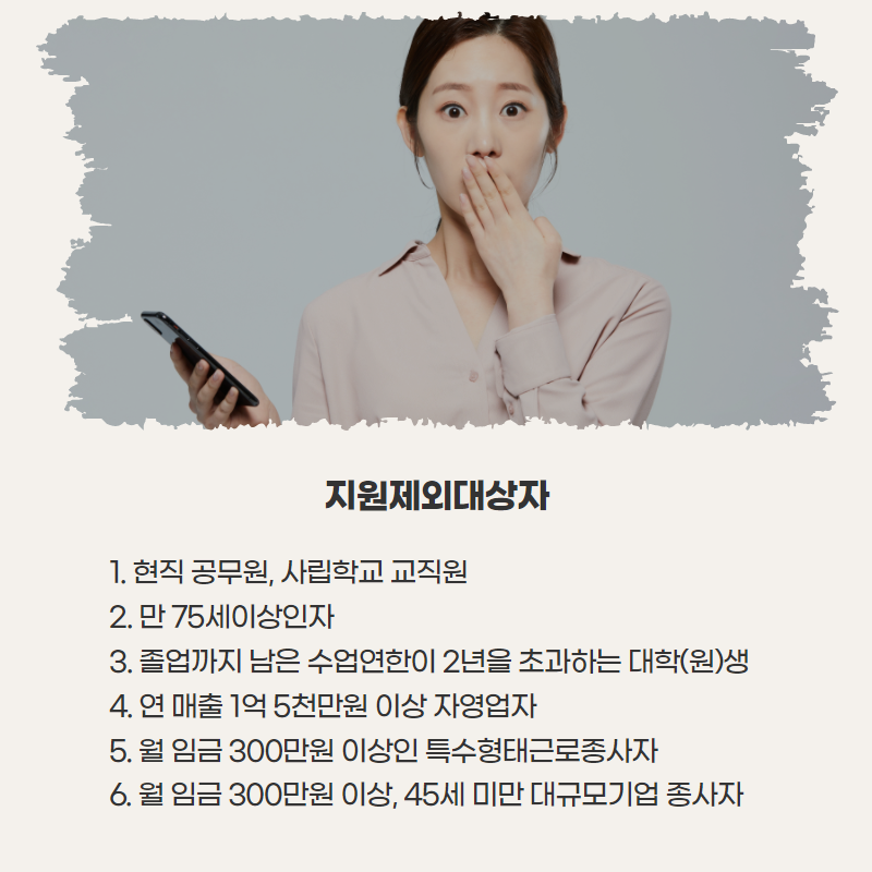 우선, 현직 공무원, 사립학교 교직원 및 만 75세 이상은 해당되지 않습니다.아까 말씀드렸듯이 졸업할 때까지 남은 수업 연한이 2년을 넘었으면 이 조건도 불가능합니다.또 연간 매출액 また また 이상 자영업자, 월 임금 また また 以上 이상 특수 형태 근로 종사자 및 월 임금 また また また で 이상이면서 45세 미만의 대규모 기업 종사자는 제외됩니다.