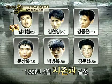 지존파 조직원 명단 김기환 2. 강동은 3김현양. 4 문상록 5 강문섭 6백병옥 7 이경숙 8 송봉우 (송봉은)
