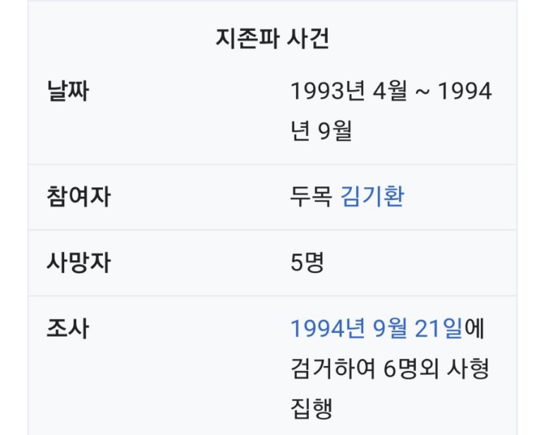 지존파 사건은 두목 김기환(당시 25세) 등 지존파 일당 7명이 1993년 7월부터 1994년 9월까지 5명을 연쇄 살해한 사건이다. 1993년 전라남도 함평군 대동면에서 부유층에 대한 증오를 행동으로 나타내고자 조직을 결성하였다. 1993년 7월 일당 6명은 충남 논산에서 최모 씨(23세)를 윤간한 뒤 살해 암시장, 같은 해 8월 조직원이었던 손봉우도 살해 암시장으로 만들었다. 전라남도 영광군 불갑면 금계리 김기환의 집 지하실 아지트에 창살 감옥과 시신을 은닉하기 위한 시신 소각 시설을 갖추었다. 1994년 9월 경기도에서 이00-이씨, 서OO-박OO 부부를 납치 감금하고 가까스로 탈출한 이씨를 제외한 3명을 모두 살해하고 시신을 토막내 인육을 먹는 등 9월 15일까지 엽기적인 연쇄살인 행위를 저질렀다. 이들이 밝힌 범행 목적은 빈부격차와 부자에 대한 증오였지만 실제 피해자는 부유층이 아니라 평범한 서민이었다. 1995년 11월 2일 두목 김기환 외 5명은 온보현과 함께 사형이 집행되었다.