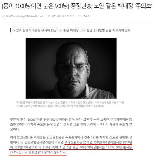 2017년 기사입니다.노안과 같은 백내장 주의보 백내장 환자는 2013년에는 109만 명 정도였으나 2017년에는 131만 명으로 증가했습니다.특히, 최근 5년 이내에 40대의 백내장 환자는 1.4배, 50대의 백내장 환자는 2.2배나 증가했다고 합니다.최근 통계를 살펴보겠습니다.