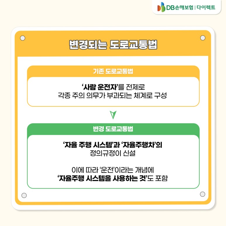 2022년 4월 20일부터 변경된 도로교통법에 따라 자율주행자동차 운전자의 준수사항과 그 위반에 대한 처벌 근거가 마련된다고 합니다. ‘자율주행 시스템’과 ‘자율주행차’ 정의 규정이 신설됨에 따라 ‘운전’이라는 개념에 ‘자율주행 시스템을 사용하는 것’도 포함돼 있습니다. 또 자율주행 시스템을 사용할 경우 운전 중 휴대폰 사용 금지 등 일부 운전자의 주의 의무가 완화될 수도 있다고 합니다. 이를 바탕으로 현행법이 자율주행차에도 적용돼 교통안전을 더욱 확보할 계획이라고 합니다!■ 자율주행차 법규에 대한 자세한 안내