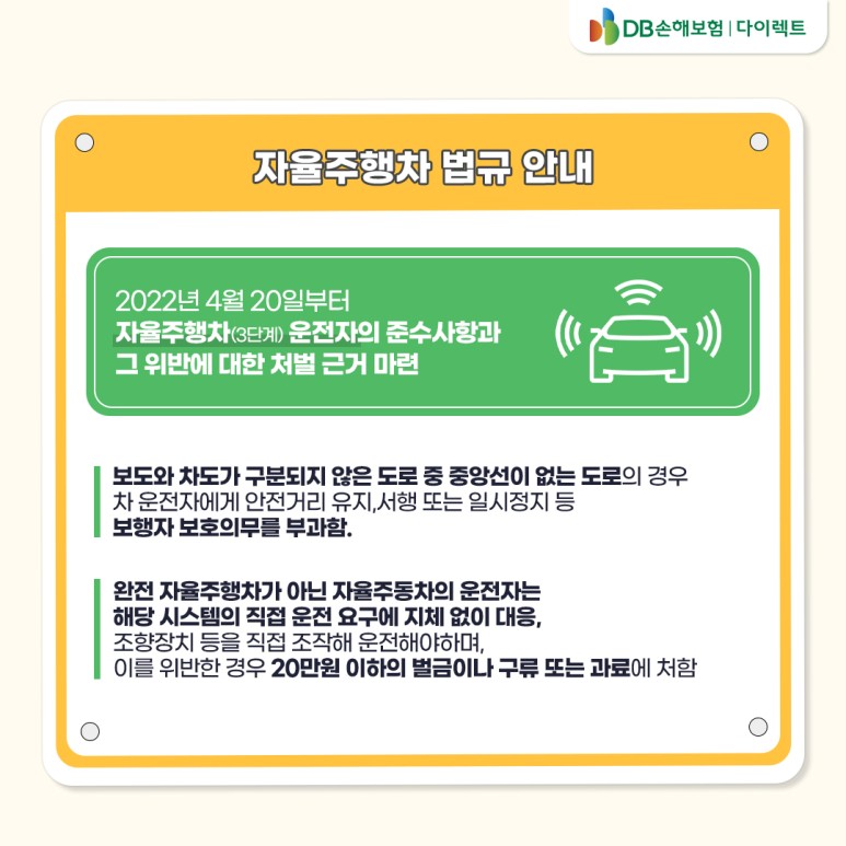 자율주행차 운전자의 준수사항과 그 위반에 대한 처벌에 대해 좀 더 자세히 살펴보려고 합니다. 우선 보도와 차도가 구분되지 않은 도로 중 중앙선이 없는 도로의 경우 차량 운전자에게 안전거리 유지, 서행 또는 일시정지 등 보행자 보호 의무를 부과한다고 합니다. 또 완전자율주행차가 아닌 자율주행차 운전자는 해당 시스템의 직접 운전요구에 지체 없이 대응해야 하고, 조향장치 등을 직접 조작해 운전해야 하며, 이를 어길 경우 20만원 이하의 벌금이나 구류 또는 과태료에 처한다고 합니다. 자율주행차 법규를 만들어 더욱 자율주행 상용화에 가까워진 것 같습니다!새롭고 편리해지는 자동차의 세계 DB 다이렉트와 함께!