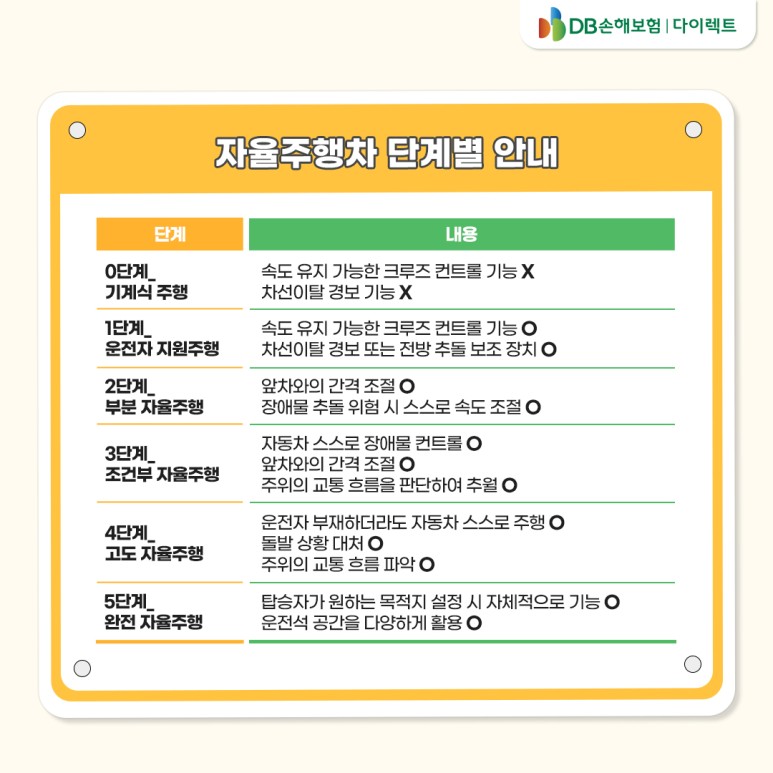 영화나 드라마 속에서 자주 듣고 조금은 익숙한 자율주행차! 이러한 자율주행차를 자세히 정의하면 자동차의 소프트웨어와 반도체가 도로 상황과 앞차와의 거리 등을 판단해 운전자가 아닌 자동차가 스스로 운전하도록 설계된 자동차를 의미합니다. 기술의 발전으로 자동차 소프트웨어와 반도체가 지속적으로 개발되고 자율주행차도 함께 발전했다고 합니다. 자율주행 자체가 먼 미래 기술로 여겨졌던 시기도 있었지만 이제는 많은 운전자들이 크루즈 컨트롤과 같은 주행 보조 기술을 많이 이용하는 만큼 자율주행이 더 가까워졌다고 느낍니다!■자율주행 단계, 0단계부터 5단계까지!