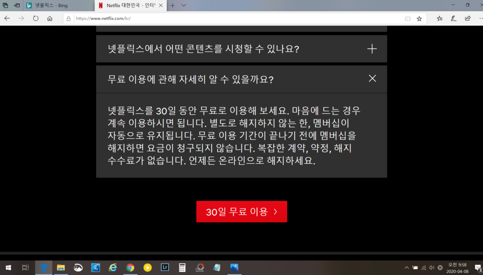 일단 넷플릭스를 눈치 보지 않고 무료로 보는 가장 편한 방법은 가입 후 한 달 무료로 보는 서비스를 이용하면 된다.한 달 안에 결제가 이뤄지기 전에 나와 맞지 않다 싶으면 가입 해지하면 된다. 해질녘도 아주 간단하다.국내 업체처럼 해지 버튼을 반드시 숨기거나 해지 항목을 온라인에서 못하게 제거하지 않는다.가입분만 쉽게 해지할 수 있으니 겁먹지 말고 가입 후 한 달간 무료로 이용하자.요즘 핫한 킹덤도 보고, 영화도 보고, 드라마 동백꽃 필 무렵도 있고, 사랑의 불시착도 있고, 이태원 클래스도 있으니 재미있게 정리해 보면 된다. 현재로서는 마블 시리즈도 있기 때문에 마블 시리즈도 모두 정리해 보면 한 달은 훌쩍 넘어갈 것 같다.