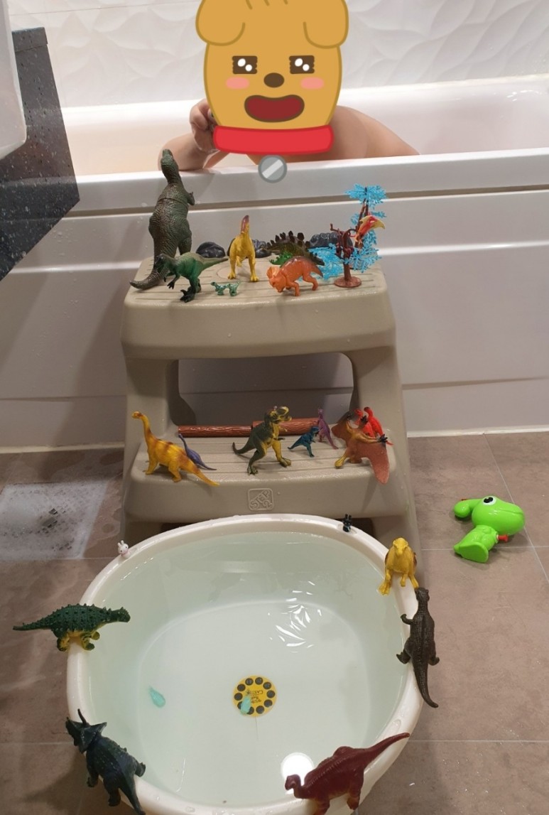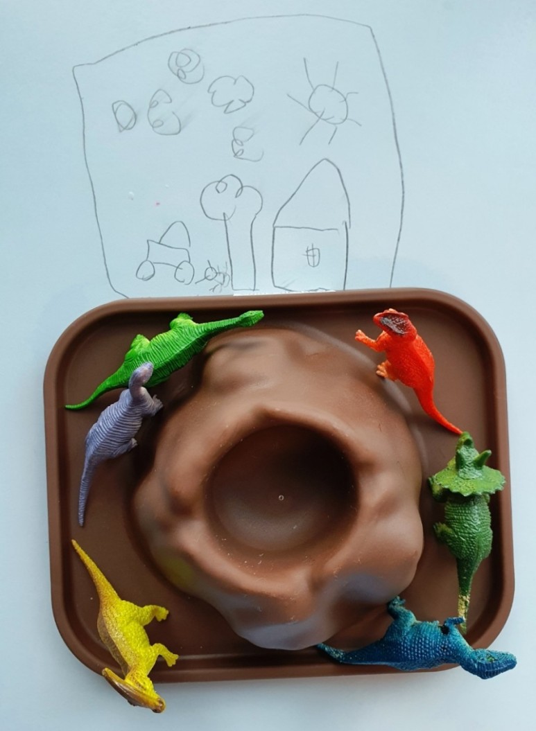 수업 전에 책상에 그림을 그리고 집에 있는 공룡들로 미리 세팅이 돼 있었어요ㅎㅎㅎ