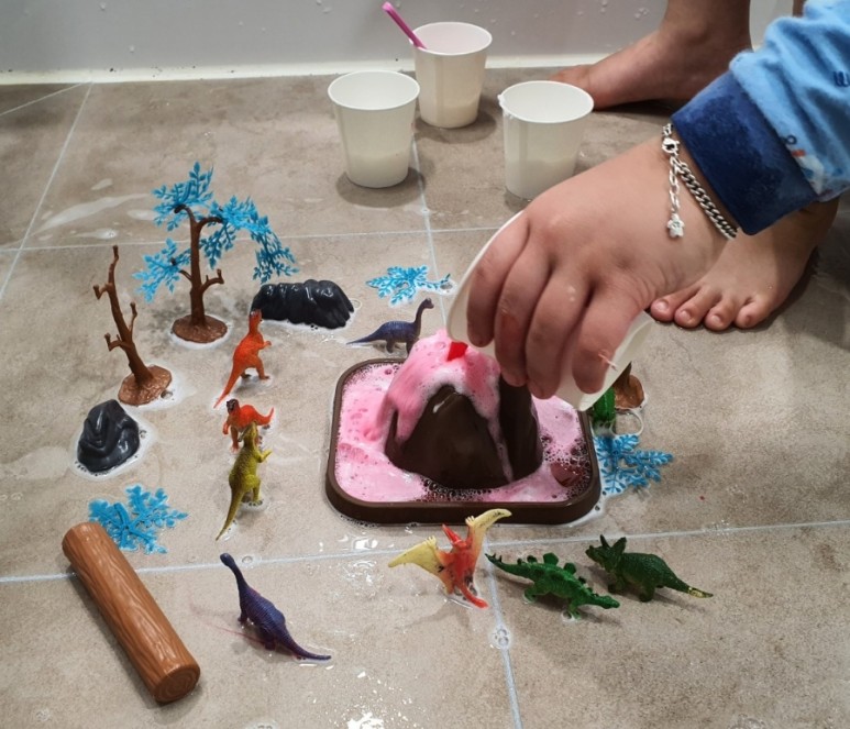 집에 있던 공룡도 세팅하고 본격적으로 화산폭발 놀이를 할 거예요