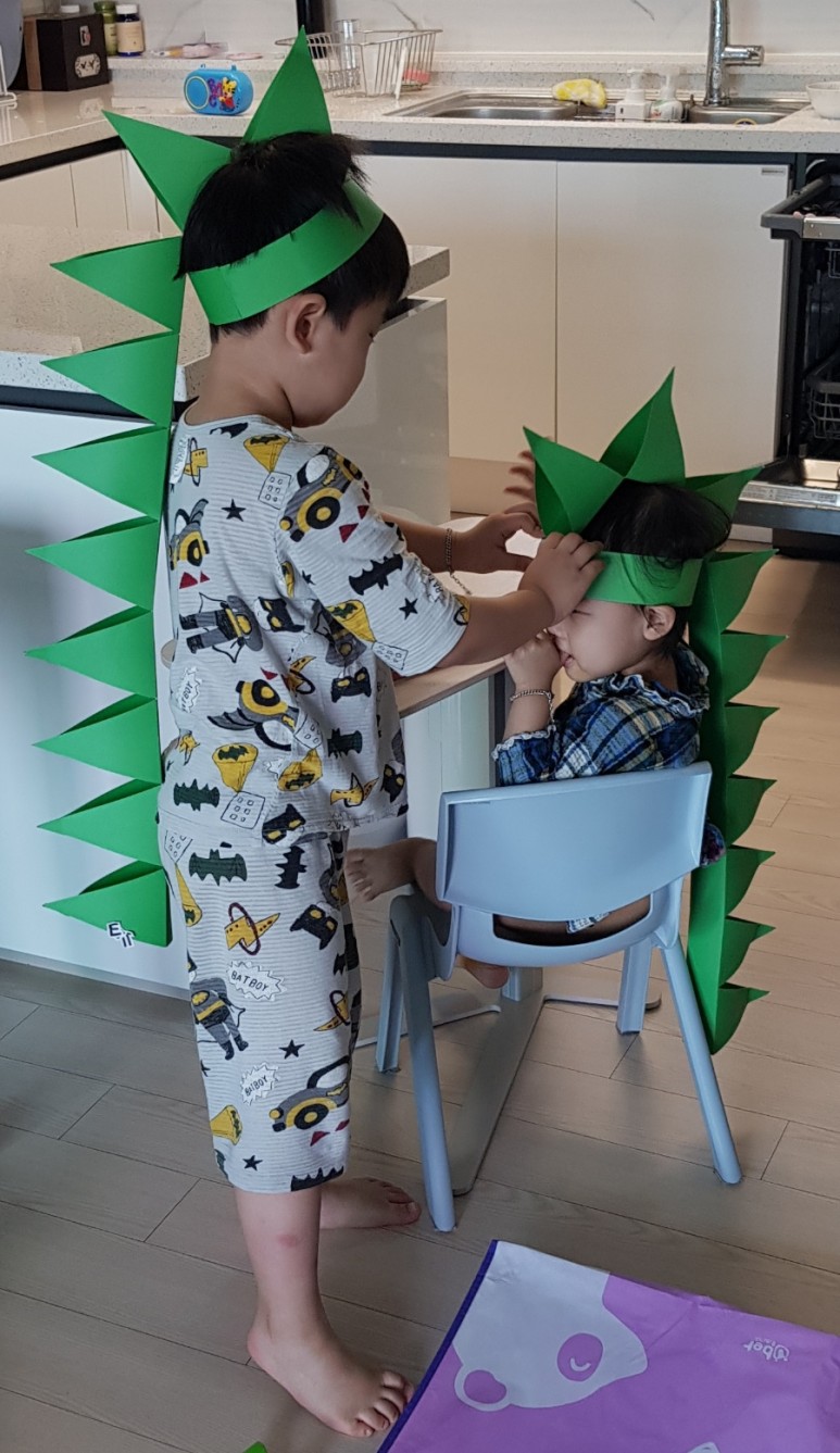 웅진북클럽 큐레이터 분이 주신 공룡 만들기로 동생과 함께 공룡으로 변신해 봤습니다.