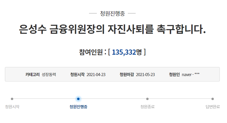 은성수 금융위원장의 망언으로 비트코인 주가가 폭락하면서 투자자들의 손실이 엄청난 것으로 알고 있습니다. 이로 인해 망언에 대한 자진사퇴를 촉구한다는 국민청원인데 참여 인원이 어마어마합니다.