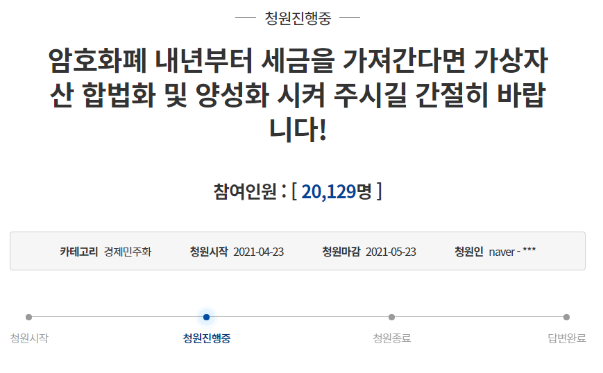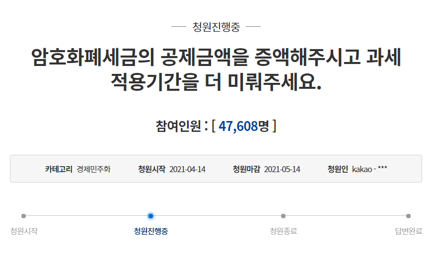 이 사건으로 많은 투자자들이 선동되어 암호화폐 내년부터 세금을 가져간다면 가상자산 합법화 및 양성화 시켜주기를 간절히 바랍니다.라고 국민청원이 진행 중이고, 이 말은 곧 세금을 걷으려면 기본적인 규제는 만들어서 투자자를 보호하라는 겁니다. 그런 것은 하나도 하지 않고 투자자의 수익을 세금만 거두려는 명분 없는 행위는 자제해 달라는 겁니다. 세금을 내지 않도록 하는 게 아니라 이런 보호조치 정도는 정부가 해야 한다는 얘기가 많습니다.