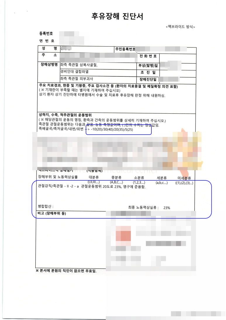 교통사고 합의금은 소득, 과실, 장애로 구성되는데 사고 당시 주부였기 때문에 소득은 일용직 근로자 임금, 과실은 10%가 확정된 상황이었습니다. 따라서 장애만 정해지면 합의금이 산출되는데요? 교통사고 등의 손해배상 사고는 맥브라이드 방식에 의해 후유 장애를 판정하지만, 발목 골절의 경우는 발목 운동 각도에 따라 7%, 10%, 12%, 23%의 적용 기준이 있습니다. 맥브라이드 기준은 위와 같은 퍼센트도 중요하지만 일시 영구장애와 같은 장애기간도 중요합니다.