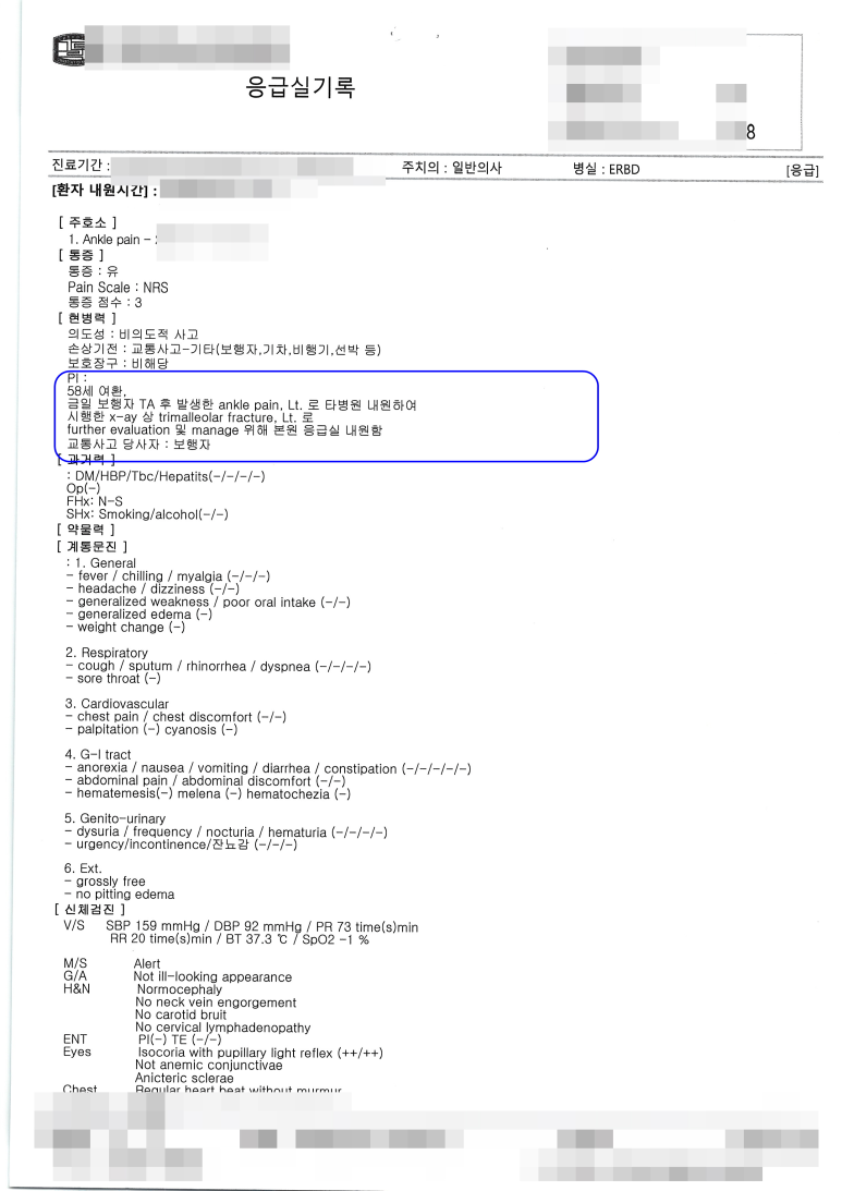 피해자는 사고 후 타 병원의 검사 결과 trimal leolar fracture (삼과골절)로 확인되었으며, 수술문제로 상급병원으로 전원 후 관혈적 정복 및 내고정술을 실시하였습니다. 사고로 인한 치료비는 보험사가 지급 보증하므로 걱정하지 마시고, 만약 비급여 치료비를 부담하셨더라도 나중에 영수증 처리가 가능하므로 걱정하지 마시고 치료에만 전념하십시오. 다만 보험사에서 피해자에게 진단서, 수술기록지, 영상판독지, 영상CD 등 다양한 서류를 요구하는 경우가 있는데, 정상적인 지급보증 절차에 필요한 서류는 진단서, 수술기록지 정도이고 영상CD는 추후 후유증 관련 분쟁시 불리할 수 있으므로 추후 제출하는 것이 좋습니다.