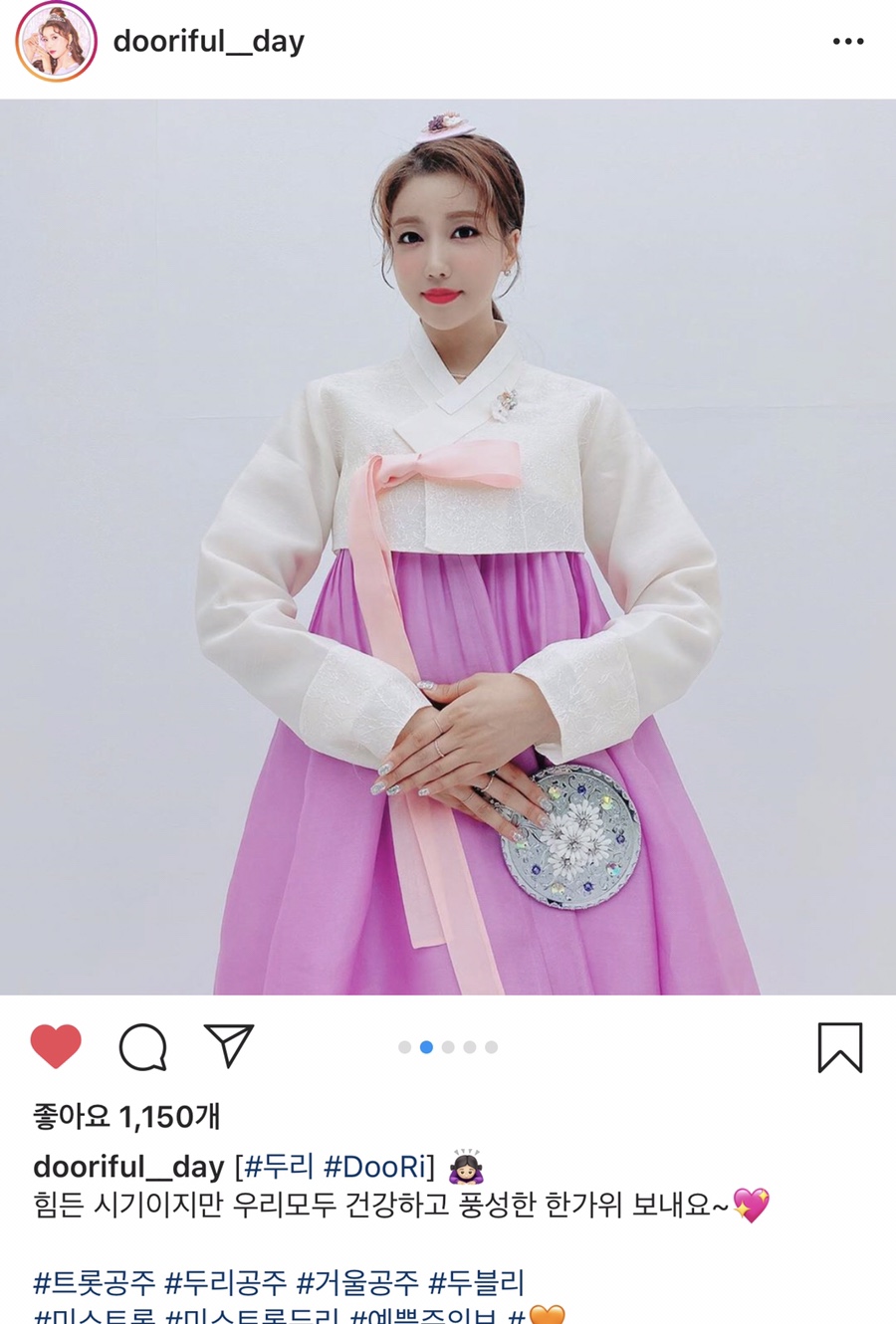 새 한복과 함께 하셨습니다^^미스트로트 점쟁이 머리 경희 두리가수님이 새 옷을 입고 추석 인사를 했어요^^*귀엽고 사랑스러운 매력이 넘쳐요! 쉽게 소화되지 않는 보라색이 콘나에게 아름답네요.^^ 미스트롯이 스두리 씨의 활발한 활동 팬으로서 응원하겠습니다^^