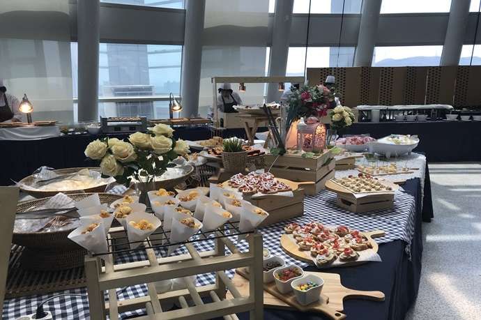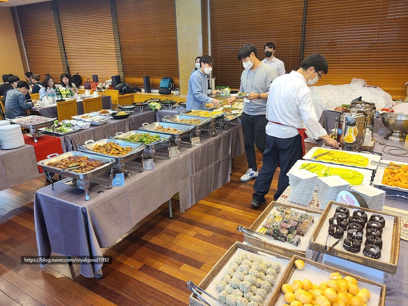 서울과 *대학교에서 진행된 뷔페 케이터링입니다.학부모 초청 행사라 담당자분이 정말 신경을 많이 쓰셨어요. 전날 미리 테이블 세팅을 해놓고 런치 뷔페를 진행한 케이스인데 새 건물에서 진행해서 그런지 조명도 너무 예쁘네요.디저트 코너가 예뻐 보이네요.