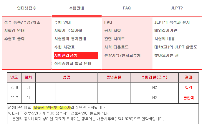 JLPT는 성적 증명서의 발행과 과거의 수험 내용의 확인의 두 가지로 나눌 수 있습니다.일단 응시자 내역을 보시면