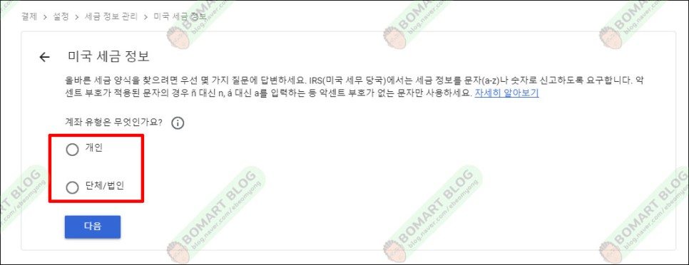 세금 정보에서 계좌 유형을 선택합니다.개인사업자라면 단체/법인나와 같은 개인은 개인을 선택합니다.
