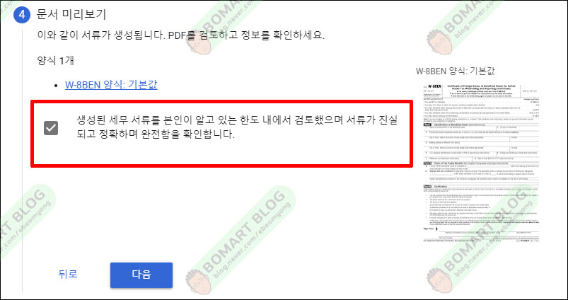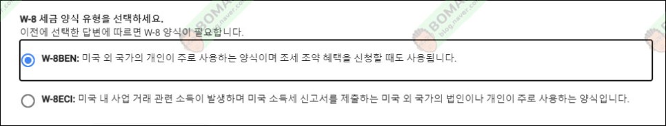 W-8의 세금 유형을 선택하고 있는데요.미국 이외의 나라에 있으므로 W-8BEN을 선택합니다.