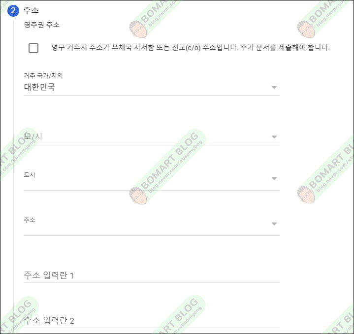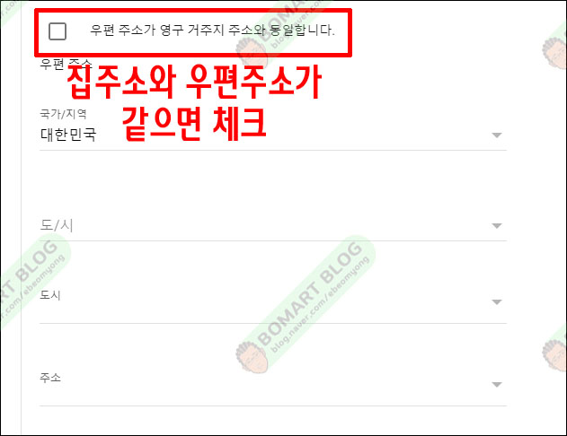 주소를 입력합니다. 이 곳에서 국가나 도시를 선택할 수 있지만 나머지는 영어로 입력해 줍니다.