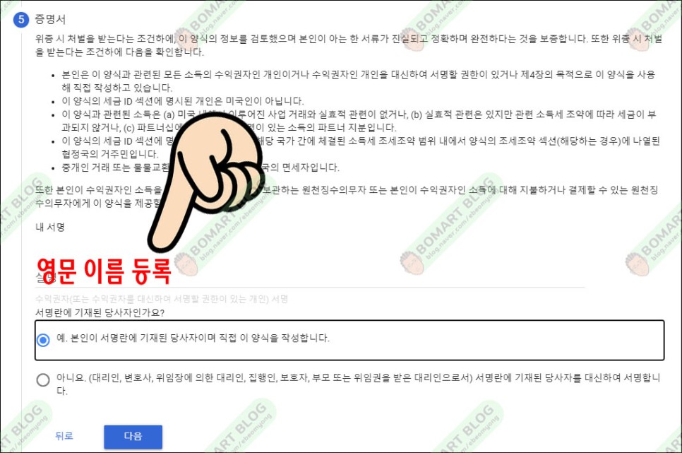 증명서에 영문 이름을 서명에 입력하고 당사자를 묻는 항목의 예를 선택합니다.