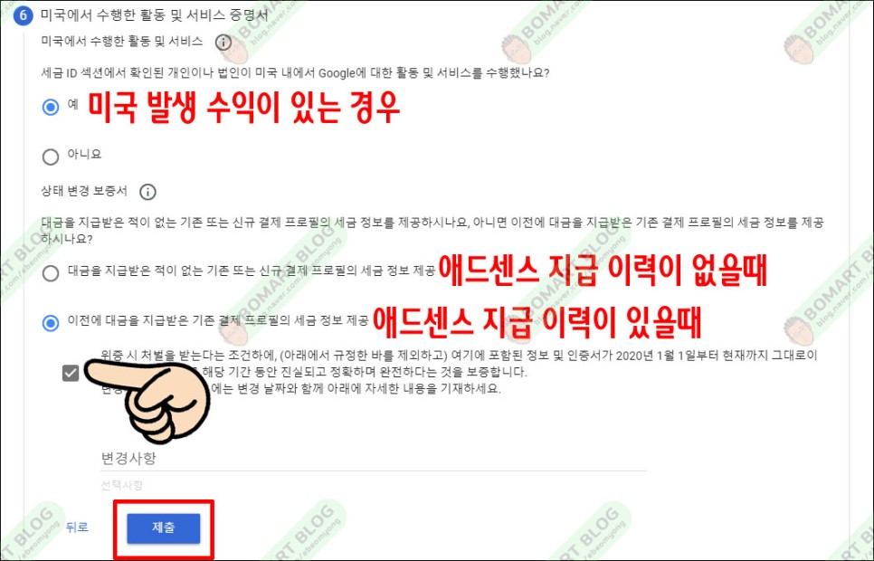 미국에서 수익이 발생했을 때는 예를 선택합니다.과거 어드센스에 의해 수익을 얻은 이력이 있는 경우를 확인하고 아래의 선택란을 선택합니다.그리고 나서 제출을 선택합니다.