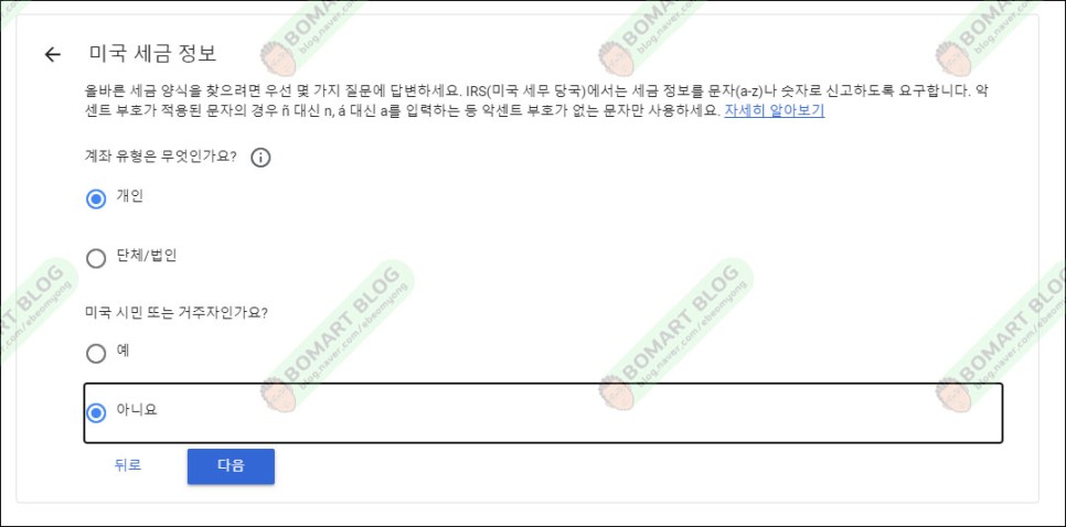 미국 시민과 거주자를 선택합니다.저는 한국에 있고 한국 사람이니까 아니오를 고를 거예요.