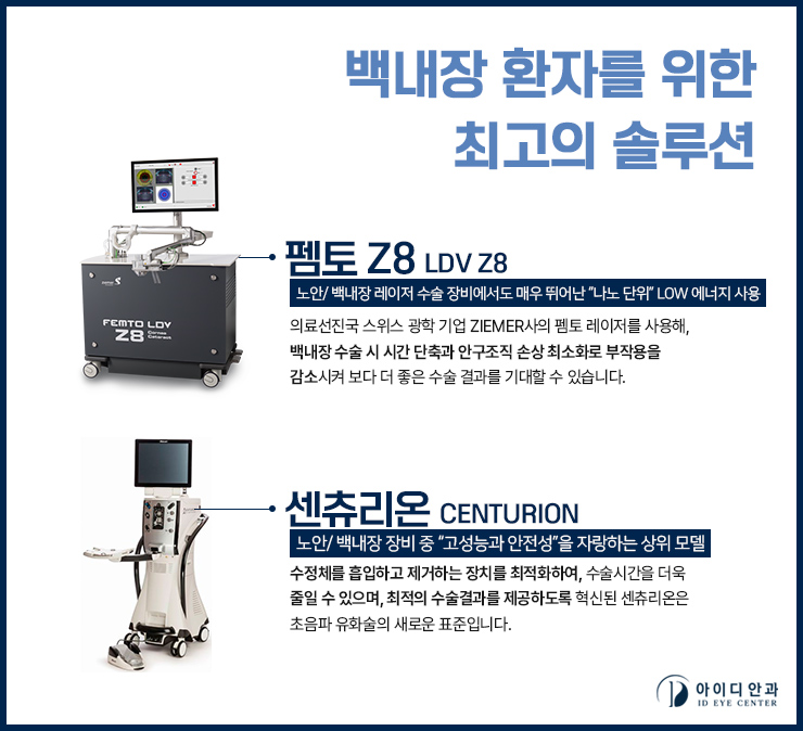 그러나 최근에는 과거 수술법의 단점을 없앤 초음파 유화술, 레이저 수술법 등이 시행되었습니다.본원에서는 백내장 수술에 최적화된 첨단 장비를 보유하여 부작용을 줄이고 정확한 결과 예후를 예측하게 되었습니다.본원에서는 대학병원급 61가지 정밀안 검진을 바탕으로 현재의 눈 상태에 대한 정확한 검사는 물론 그에 맞는 수술 방법을 제시함으로써 부작용을 줄일 수 있었습니다.수정체 흡입과 제거에 최적화된 센츄리온 장비가 구비되어 있으며 레이저 수술은 첨단 장비인 펨토 LDVZ8을 활용하였습니다.짧은 시간 안에 낮은 에너지로 각막, 수정체낭을 미세 절개해 손상을 줄이고 2차 합병증의 문제도 개선했습니다.백내장 수술시간도 대략 10~15분 전후로 매우 짧고, 신속한 진행과 회복을 기대할 수 있었습니다.저희 병원은 이렇게 초음파와 레이저 수술로 개인에게 맞는 방법을 제시하고 있었습니다.그리고 약간의 안정 후 바로 일상 생활을 할 수 있기 때문에 시간적 부담도 줄일 수 있었습니다.