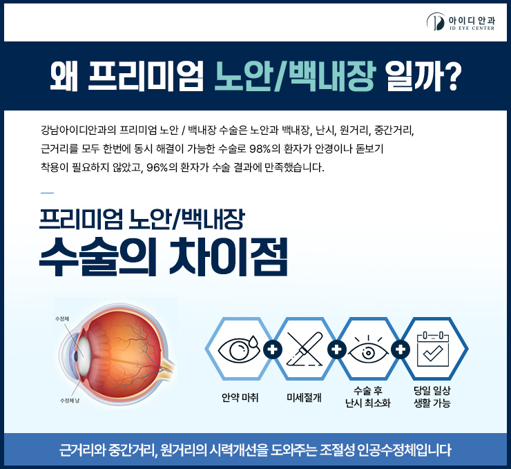 어떤 인공수정체를 삽입하느냐에 따라서도 만족도 차이가 나는 편이었습니다저희 병원에서는 세계적으로 안전성을 인정받은 인공 수정체만을 보유하고 있었습니다.특정 렌즈만을 고집하는 것이 아니라, 개개인의 라이프 스타일, 상태, 상황등을 모두 고려하고, 거기에 맞는 인공 수정체를 선택하게 되었습니다.특히 다초점 인공수정체의 경우 근시, 원시, 난시 등 굴절 이상의 문제도 동시에 개선되기 때문에 백내장 치료를 함으로써 노안 개선까지 한 번에 할 수 있다는 이점도 있었습니다.어느 거리에서도 초점교정이 이루어지기 때문에 안경, 돋보기도 필요없이 만족도가 높은 편이었습니다.