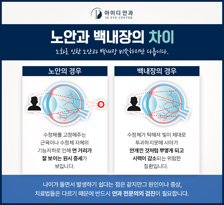 나이가 들수록 노안이 생기는 게 당연하다고 생각하는 분들이 많았어요그러나 노안과 백내장은 초기 증상이 비슷하기 때문에 반드시 검사를 해야만 했습니다.노화에 의해 수정체 또는 수정체를 잡는 근육의 탄력이 떨어지면, 근거리물의 초점 맞추기가 잘 되지 않아, 원시가 생깁니다.우리는 그것을 노안이라고 불렀습니다.그러나 백내장은 렌즈와 같은 역할을 하는 수정체 내부가 혼탁해져 빛이 들어와도 망막으로 제대로 전달되지 않는 것이었습니다.수정체의 혼탁으로 불규칙한 빛의 굴절 때문에 시력 저하를 비롯한 전반적인 시력 장애를 초래하게 되었습니다.초기의 혼탁 정도에 따라서는 약간의 시력저하, 피로감 등을 느낄 수 있기 때문에 단순한 노안으로 오해받기 쉬웠습니다.그러나 점차 증상이 심해지자 물건이 2, 3개로 보이는 복시 등이 발생했습니다.또한 밝은 장소, 갑작스러운 빛 등이 비추면 망막에 빛이 도달할 수 없기 때문에 오히려 어두운 장소에서 시야가 잘 보여 쾌적하게 느껴지는 특징이 있었습니다.이와 같이 노안과 백내장은 증상이 매우 비슷해서 혼동되기 쉬웠습니다.이 안질환은 방치할 경우 합병증은 물론 실명의 위기에까지 이를 수 있으며, 그 전에 적절한 검진과 적극적인 치료가 뒤따라야 했습니다.
