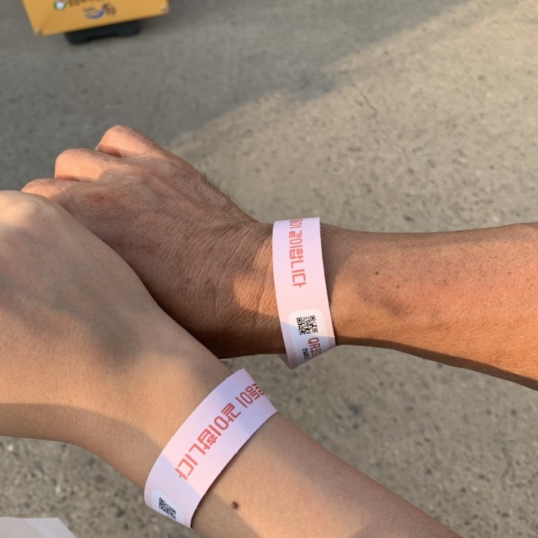 이 밴드가 입장 티켓! 무대 앞에 자리를 뜨기 전에 “아빠, 이건 이렇게 인증샷을 찍어야 돼”라며 손을 내밀듯 해서 찍었다.