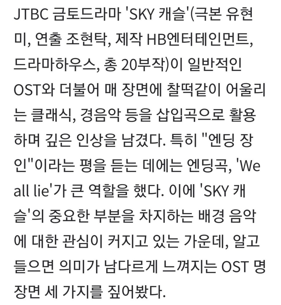 2. 스카이캐슬 김태성 음악감독은 OST에 많은 관심과 사랑을 주셔서 감사하다며 순종적이었던 여성의 통쾌한 반격, 잘못된 교육관 풍자 등 드라마가 하고자 하는 이야기를 표현하기 위해 다양한 음악을 활용했다고 설명했다.출처 : http://naver.me/IG6rA1TZ [스포츠조선의 이유와 기자]SKY 캐슬의 격이 다른 OST가 시청률 상승에 한몫했다. 게다가 매번 엔딩을 장식해 화제를 모았던 신인 아티스트 하진의 Weallie가 오늘(12일) 정오에 발매되는 naver.me의 노래만 들어도 명장면이 떠오르는 드라마도 음악의 힘이 대단하다고 봅니다.