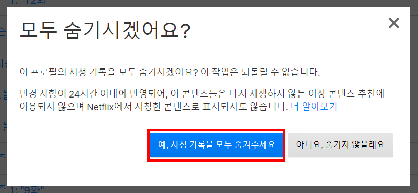 모두 숨기기를 누르는 경우 모두 숨기기라는 재확인 팝업창이 뜨고 네, 시청기록 모두 숨기세요를 누르면 시청기록 삭제가 완료된다.